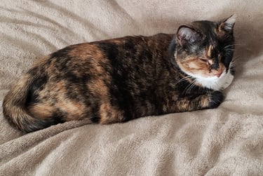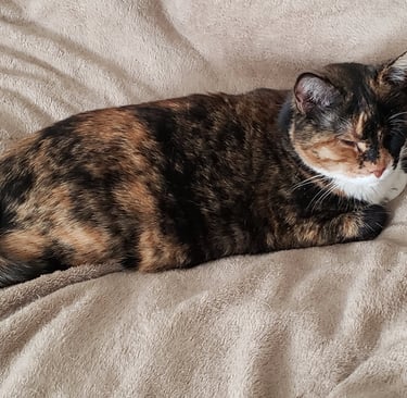 This is Calico Jack. The picture on the loveseat is when he first came to us, neglected, underweight, and sick with pneumonia. The picture outside is Jack now. What a difference!
